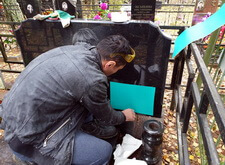 по приезду на кладбище мы промерили уже нанесённые на памятник надписи, затем по их образу и подобию изготовили идентичный трафарет, который наклеили на надгробье.