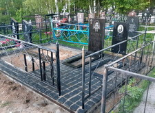 В данном заказе нам предстояло переоформить уже существующее место захоронения. Клиент пожелал облагородить могилу, выложив её территорию брусчаткой, заменив лавочку со столиком и обновив памятники. Обговорив все детали предстоящей работы, мы осмотрели участок. На нижеприведённых фотографиях отображено изначальное состояние места захоронения.