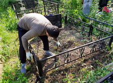 Первым делом мы принялись за уборку: удалили всю траву с территории места захоронения, а также пропололи периметр могилы, облегчив доступ к ограждению. Сорняк мы упаковали в мешки и в дальнейшем вывезли с территории кладбища.